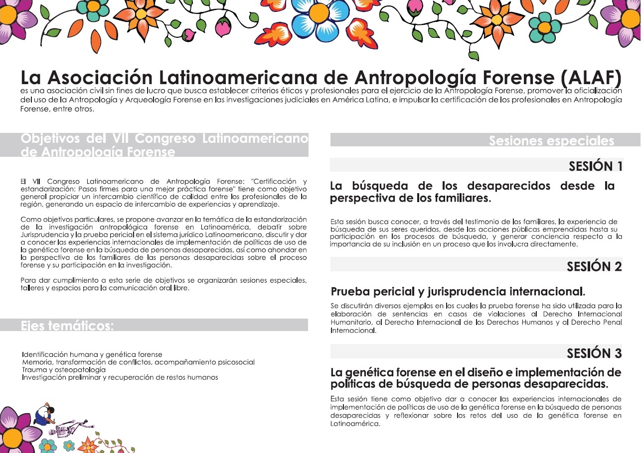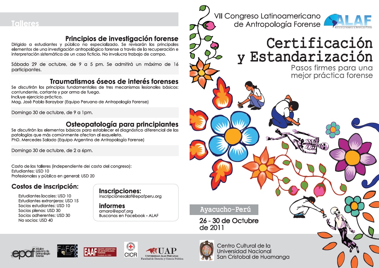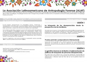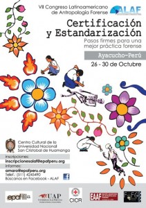 Del 26 al 30 de octubre del presente año, en el Centro Cultural de la Universidad de Huamanga, Ayacucho, la Asociación Latinoamericana de Antropología Forense (ALAF), realizará el VII Congreso Latinoamericano de Antropología Forense «Certificación y estandarización: Pasos firmes para una mejor práctica forense», un encuentro entre antropólogos forenses de la región que abordará la institucionalización de las técnicas y procedimientos de la antropología forense en Latinoamérica. El Congreso tratará temas como la búsqueda de desaparecidos desde la perspectiva de los familiares, la prueba pericial y jurisprudencia internacional y la genética forense en el diseño e implementación de políticas de búsqueda de personas desaparecidas. Además, se impartirán talleres sobre traumatismos óseos de interés forense, osteopatologías para principiantes y principios de investigación forense. Participarán miembros destacados de los principales equipos forenses latinoamericanos como el Equipo Argentino de Antropología Forense (EAAF), el Equipo Peruano de Antropología Forense (EPAF), la Fundación de Antropología Forense de Guatemala (FAFG),  el Grupo de Investigación en Arqueología Forense (GIAF), el Equipo Colombiano de Antropología Forense (ECIAF), entre otros. La Asociación Latinoamericana de Antropología Forense (ALAF) es una asociación civil sin fines de lucro que busca establecer criterios éticos y profesionales para el ejercicio de la Antropología Forense, promoviendo la oficialización del uso de la Antropología y Arqueología Forenses en investigaciones judiciales, impulsando la acreditación a través de la creación de un directorio independiente. Datos: